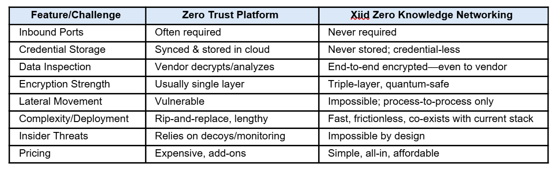 Xiid’s Zero Knowledge Networking is Secure by Design: No open ports, credential-less authentication, no data exposure, and it deploys in minutes, all without breaking your existing stack.